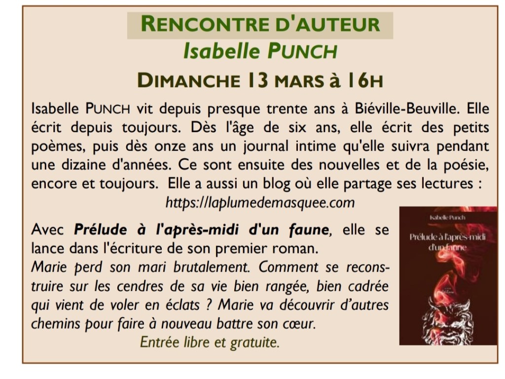 Prélude à l’après-midi d’un faune Rencontre à la Bibliothèque de Biéville-Beuville Rencontre à la médiathèque de Mathieu Partager : Partager sur X(ouvre dans une nouvelle fenêtre) X Partager sur Facebook(ouvre dans une nouvelle fenêtre) Facebook J’aime chargement…